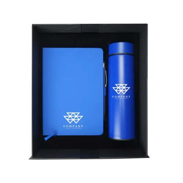 Included: 1. MBA5PU: Notebook with Pen Holder in A5-sized, PU leather, 70g Ruled Paper, and 96 sheets. | 2. PN44: Stylus Metal Pen. | 3. TM-043: Smart Temperature LED Display Bottles.