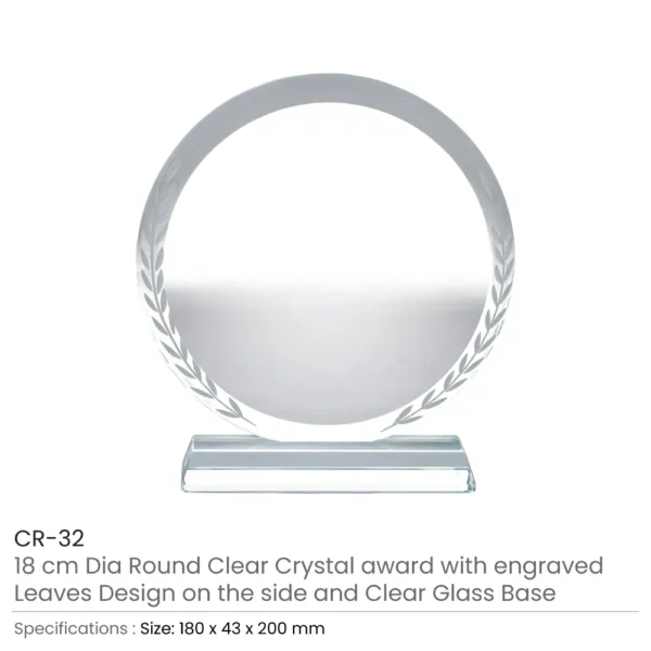 - Design: Elegant round clear crystal award with engraved leaf detailing